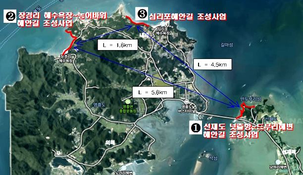 조성되는 해안길은 장경리해수욕장에서 농어바위 해안길의 해상관광탐방로 637m, 백사장길 179m이며, 십리포해수욕장 해안길의 해상관광탐방로 769m, 선재도 넛출항에서 드무리 해변 해안길의 해상관광탐방로 776m, 자갈해변길 202m 등이다.