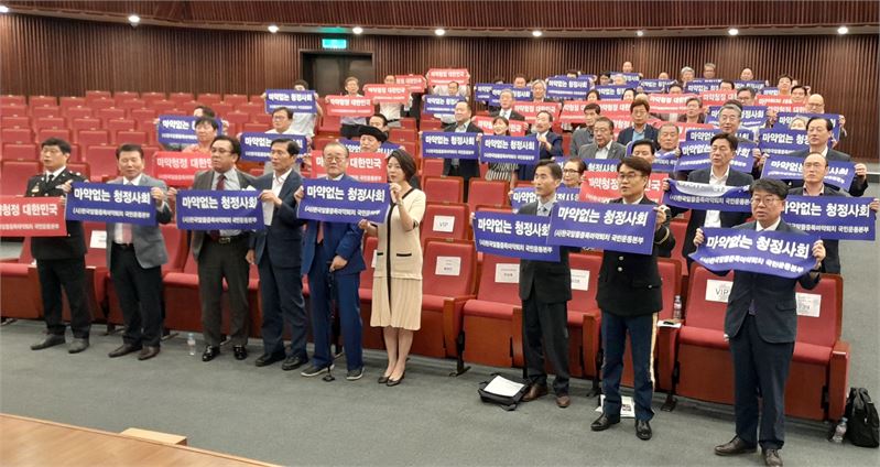 ▲ 한헌교 회장(앞줄 왼쪽에서 다섯번째)가 지난 6월26일 국회도서관 대강당에서 가진 한알마 출범식에 정치계와 시민단체 등이 참여해 마약퇴치 및 마약청정국 선포식을 가졌다.