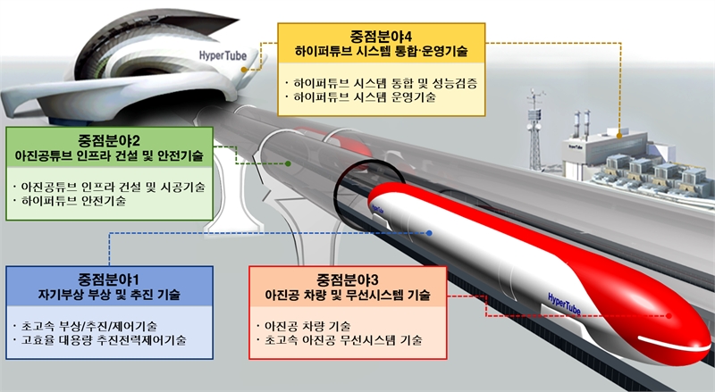 하이퍼튜브의 초격차 기술을 구현하기 위해서는 차량을 고속 주행시키는 ▲ 자기부상·추진 기술, 극한의 아진공 환경(0.001~0.01 기압)을 유지하는 주행 통로인 ▲ 아진공 튜브 설계·시공 기술, 아진공으로부터 객실 기밀을 유지하며 안정적인 승차감을 제공하는 ▲ 차량 설계·제작 기술 등이 요구된다.