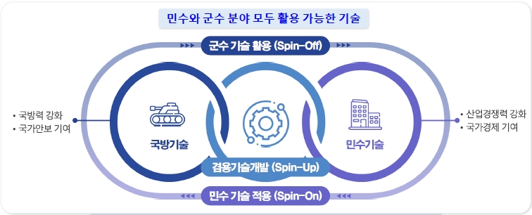 민군기술협력사업은 민군기술협력사업 촉진법에 근거하여 ‘99년부터 시작된 대표적인 범부처 협력사업(15개 부처 참여)으로 민군 겸용기술 개발(Spin-up), 민간기술의 국방분야 활용(Spin-on), 국방기술의 민간분야 활용(Spin-off)과 민과 군의 규격을 표준화하고 기술정보를 교류하는 사업 등으로 구성되어 있다.